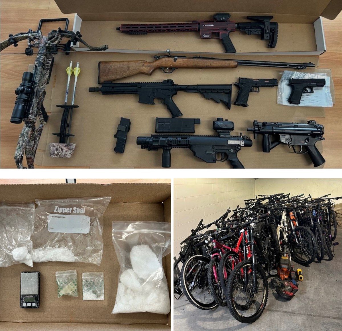 On account of the search warrants, officers recovered portions of suspected crystal methamphetamine, cocaine and fentanyl with an estimated whole worth of greater than $14,000. Officers additionally recovered a number of actual and duplicate firearms, a stolen crossbow, a do-it-yourself performed vitality weapon and suspected stolen property together with greater than 40 bicycles, three bikes, instruments and a driving lawnmower.