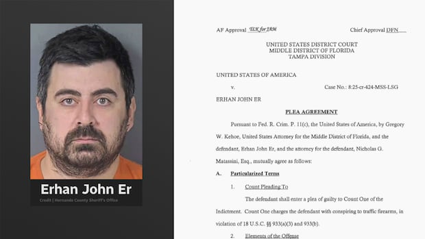 Er’s co-conspirator –    the Canadian who paid him $1,000 fee       for each gun he         smuggled –          is only identified as “Person -1”          in         the plea agreement. The unnamed suspect      has not been charged. P />Kehoe, the Tampa-based prosecutor told CBC   t h e matter “continues     t o b e under investigation, w i t h regard t o t h ata individual.”