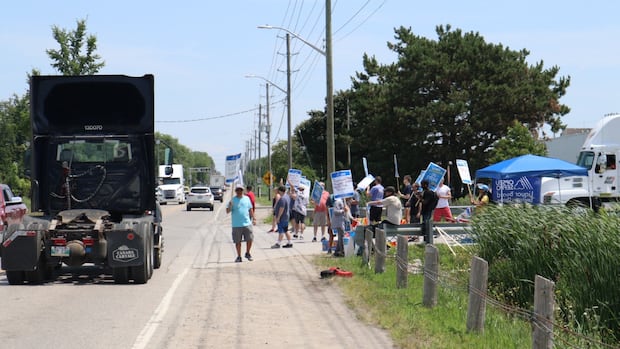 LCBO staff might be seen picketing in entrance of varied storefronts Monday, nonetheless the biggest presence, pictured right here, was in entrance of the LCBO logistics facility on Wilton Grove Street. (Alessio Donnini/)
