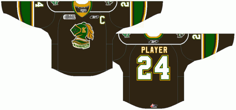 What does this London Knights jersey look like? It’s a black jersey featuring gold, green, and white accents. ♥ FavouriteOther London Knights Logos and Jerseys from this time
