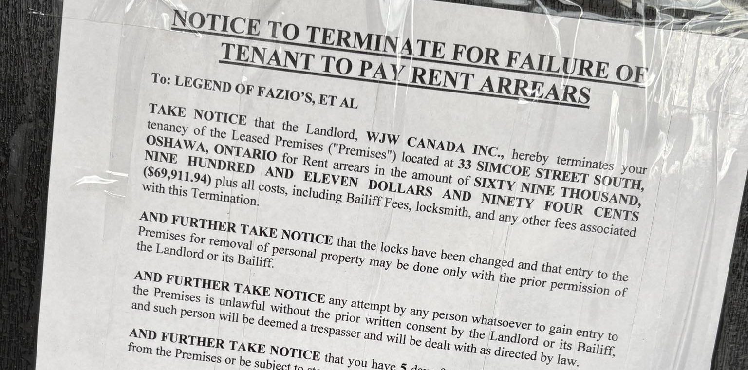A steakhouse in downtown Oshawa has closed its doors, with a notice on the front door from the landlord stating that the restaurant owners are behind on nearly $70,000 in rent.