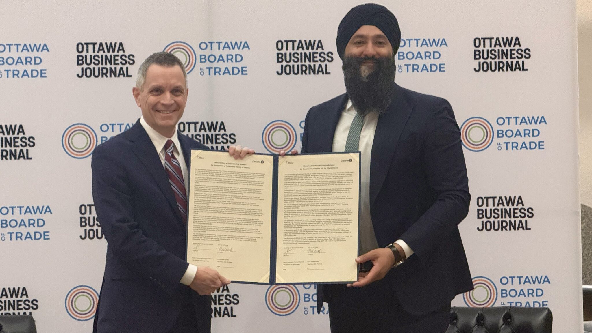 Ottawa Mayor Mark Sutcliffe with Minister of Transportation Prabmeet Sarkaria. The pair signed a deal to move the upload of the LRT forward. (Mark Sutcliffe/ X)
