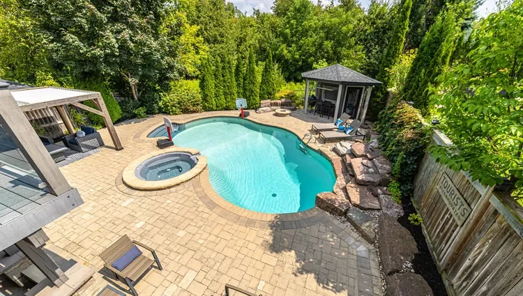 Centrally located within this residence at 3 Covington Drive lies an entertainer’s delight-the stylish kitchen equipped entirely with premium appliances opening into expansive great room showcasing gas fireplace views overlooking ravine scenery paired perfectly outside where backyard oasis awaits complete featuring kidney-shaped heated pool measuring16 x32 ft., hot tub cabana along propane fire pit setup perfect relaxation!