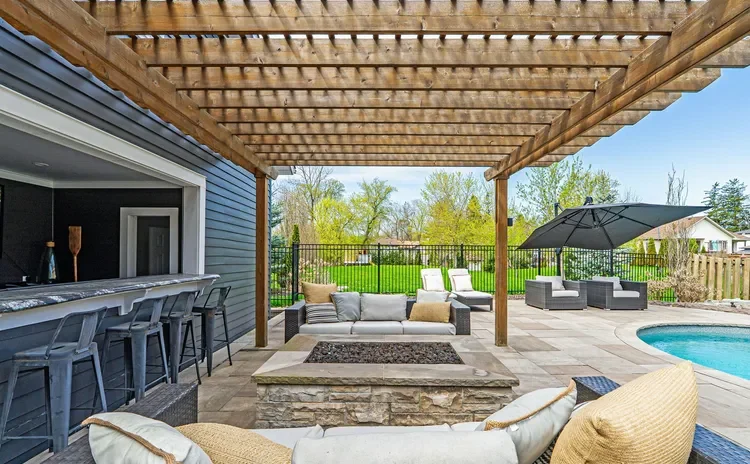 The fresh flooring throughout gives it a contemporary feel and the finished basement provides versatile space suitable for various uses like a gym or playroom based on your needs. Outdoors features include a saltwater pool complete with changing facilities as well as an inviting cabana bar alongside fire pit seating areas and even an enchanting treehouse.