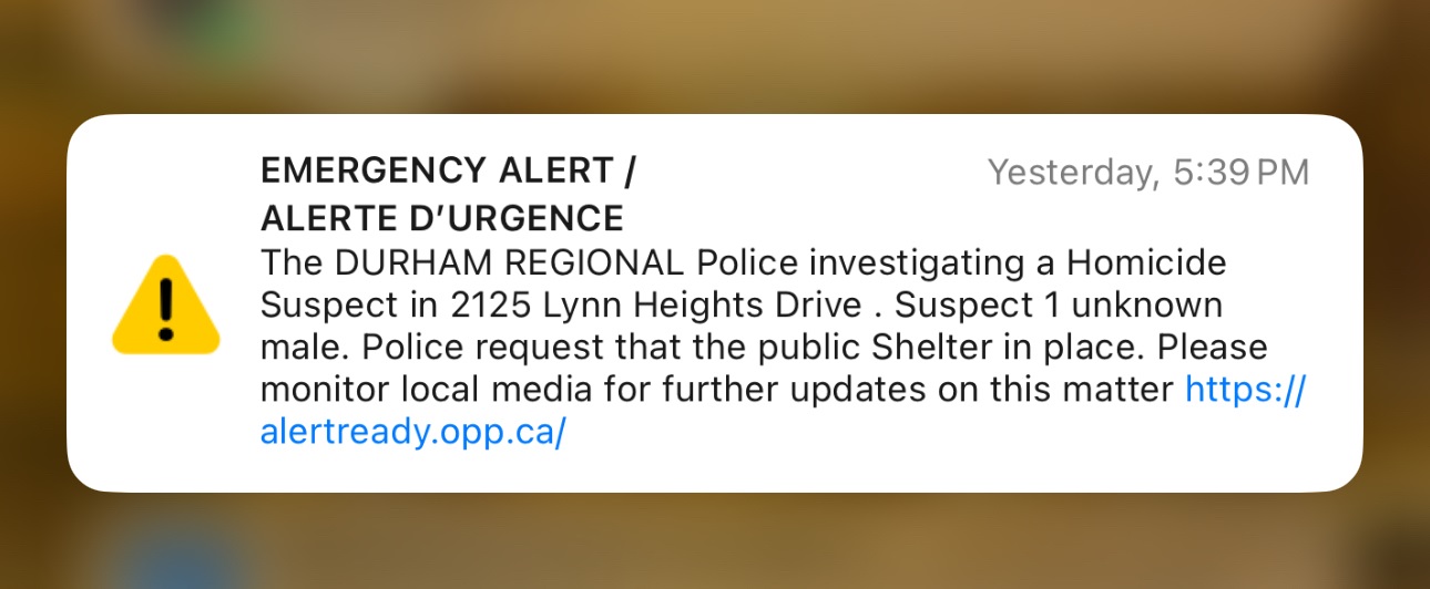 “The Durham Regional Police investigating (sic) a homicide suspect in 2125 Lynn Heights Drive. Suspect 1 unknown male. Police request that the public shelter in place. Please monitor local media for further updates on this matter,” the alert read.