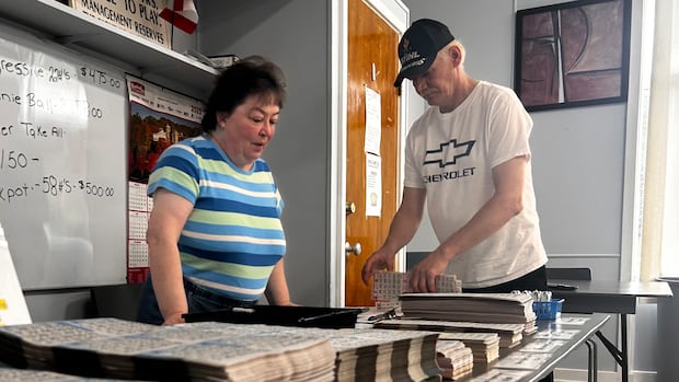 Wanda and Gerald ‘Junior’ Resmer, from Quadeville, Ont., get ready for the local community’s weekly Friday bingo game. They knew the girl who was attacked on June 24 and expressed their sorrow upon learning about the charges against a 17-year-old boy for attempted murder and sexual assault. (Lisa Mayor/CBC)