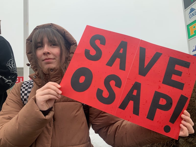 Student with sign A Simcoe County student holds a sign in protest of the Ontario government’s cuts to OSAP funding on Wed., March 11, 2026. ( /Rob Cooper)