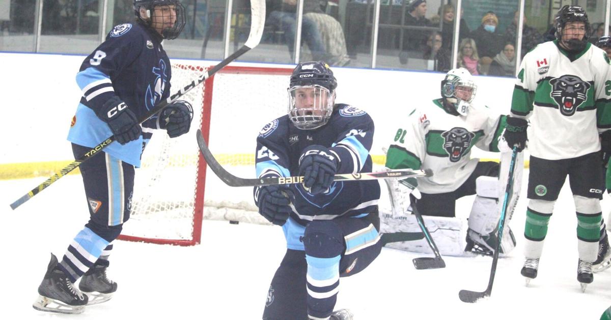 Port Colborne’s Hudson Wozney (68) celebrates a power-play goal in Greater Ontario Hockey League action versus Pelham at Vale Centre in Port Colborne.