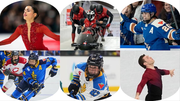 Madeline Schizas, top left, Keaton Bruggeling, top centre, Renata Fast, bottom left, Emma Maltais, bottom centre, Sarah Nurse, top right, and Trennt Michaud, bottom right, are all competing in the Milano-Cortina Olympics this month. (Justin Tang/The Canadian Press, Seth Wenig/The Associated Press, Sammy Kogan/The Canadian Press, Lindsey Wasson/The Associated Press, Ethan Cairns/The Canadian Press, Ashley Landis/The Associated Press)
