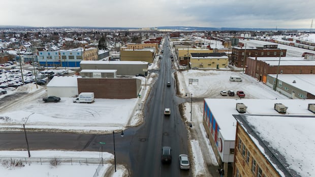 An aerial shot of Simpson Street in Thunder Bay, Ont., taken in January 2026. The neighbourhood has gone through many changes over the years. (Marc Doucette/CBC)