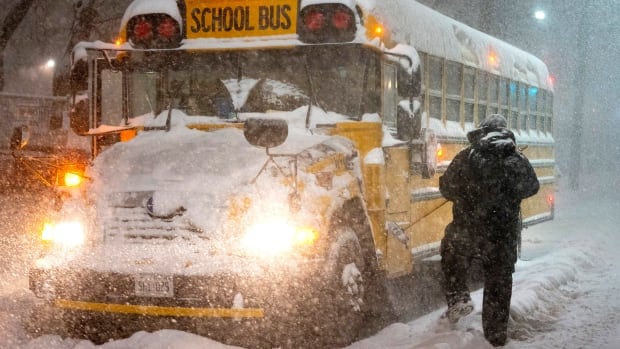 A school bus driver tries to clear snow from the bus as conditions worsened during a snowstorm. (Frank Gunn/The Canadian Press)