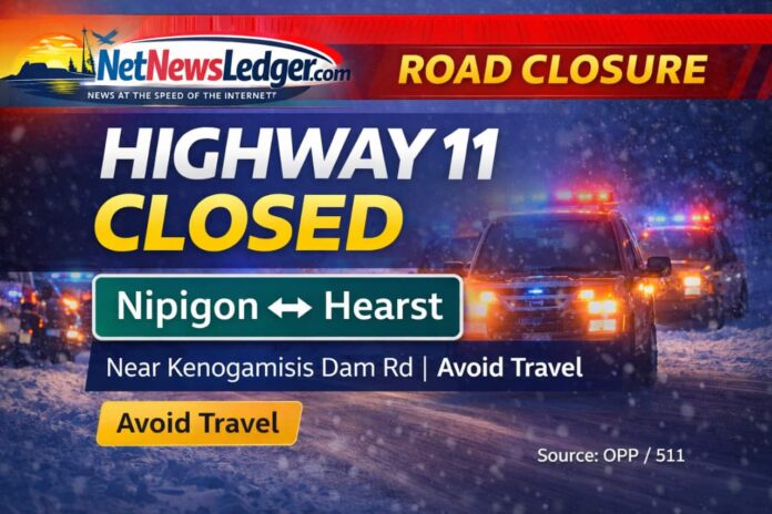 Ontario 511 is reporting an all-lanes-closed incident on Highway 11 in the Longlac-Geraldton region, indicating broader disruptions along this route.