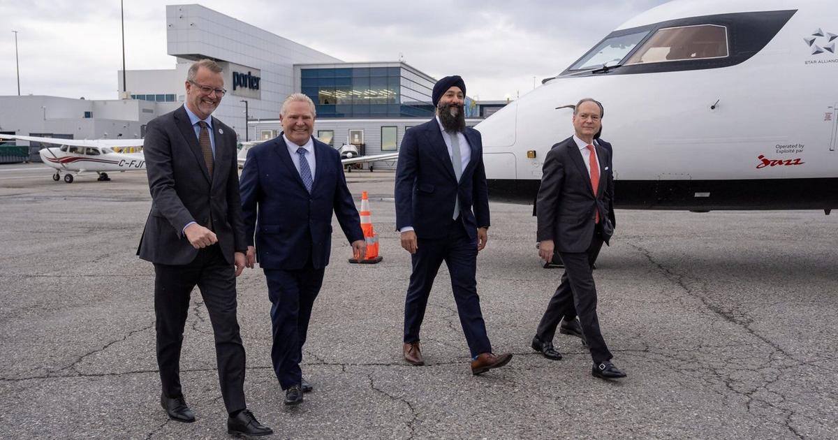 Toronto Port Authority President and CEO RJ Steenstra, left to right, Ontario Premier Doug Ford, Ontario Transportation Minister Prabmeet Singh Sarkaria and Ontario Finance Minister Peter Bethlenfalvy arrive at an event at Billy Bishop Toronto City Airport on Monday March 23, 2026. THE CANADIAN PRESS/Frank Gunn