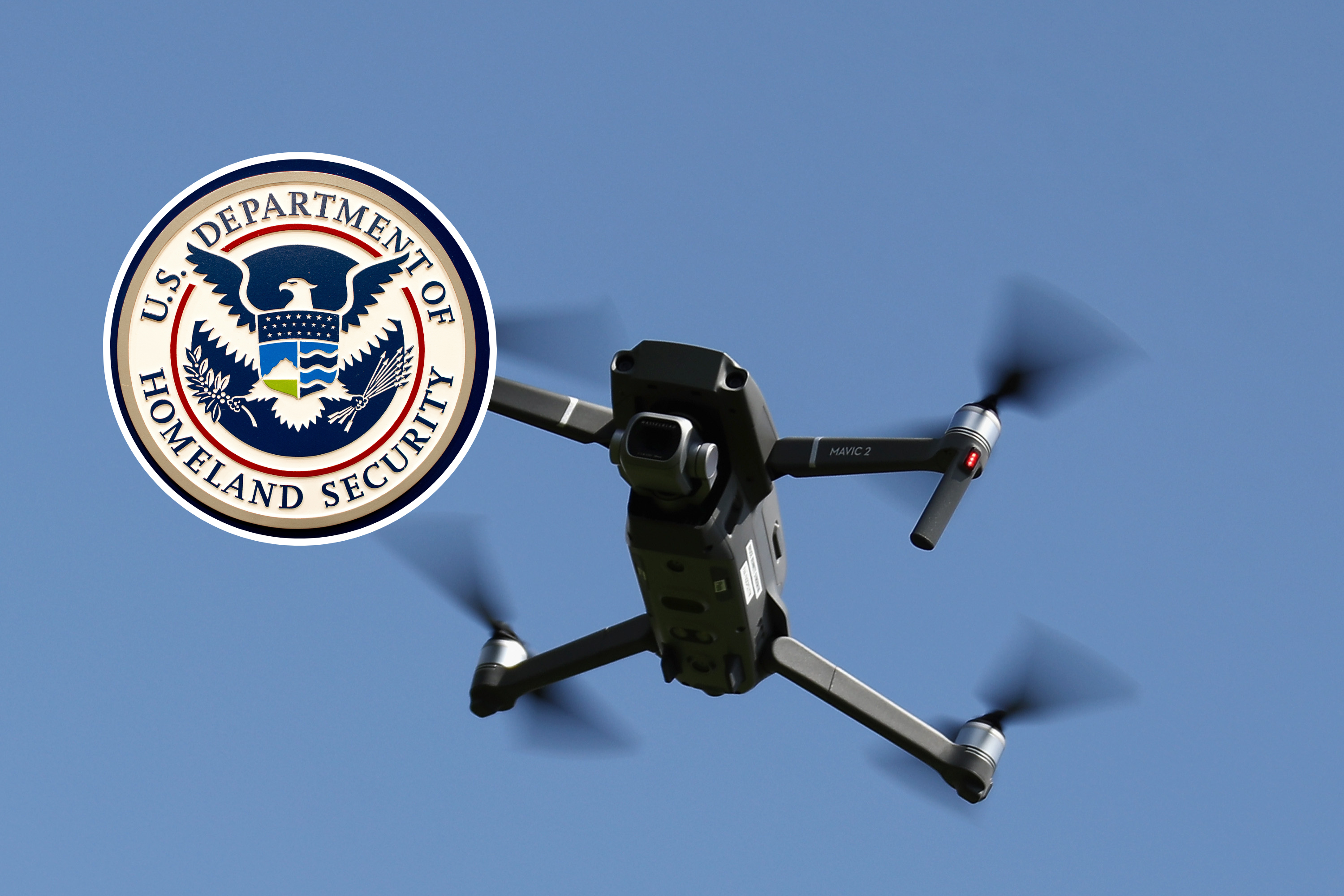 A drone flies within the skies over Bethpage State Park on Might 7, 2020, in Bethpage, New York. Inset, the Homeland Safety emblem is seen August 26, 2011, at FEMA headquarters in Washington, DC. New…